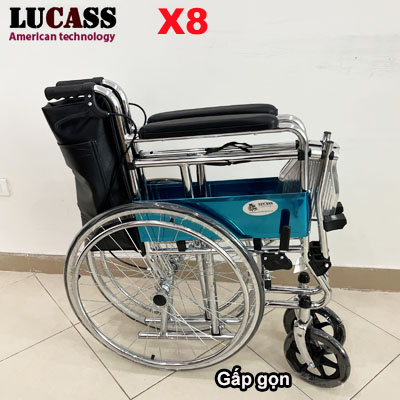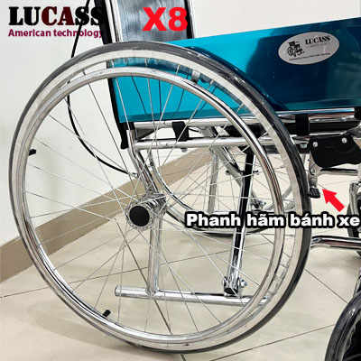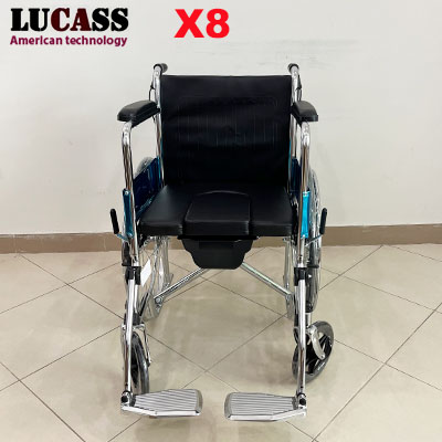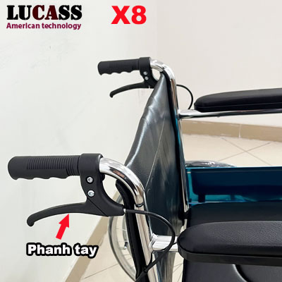 Xe lăn có bô vệ sinh Lucass X8 thế hệ mới được nâng cấp từ sản phẩm xe lăn Lucass trước đây, có thêm phanh tay, đáp ứng được yêu cầu của người phục vụ, phanh lại khi cần thiết.